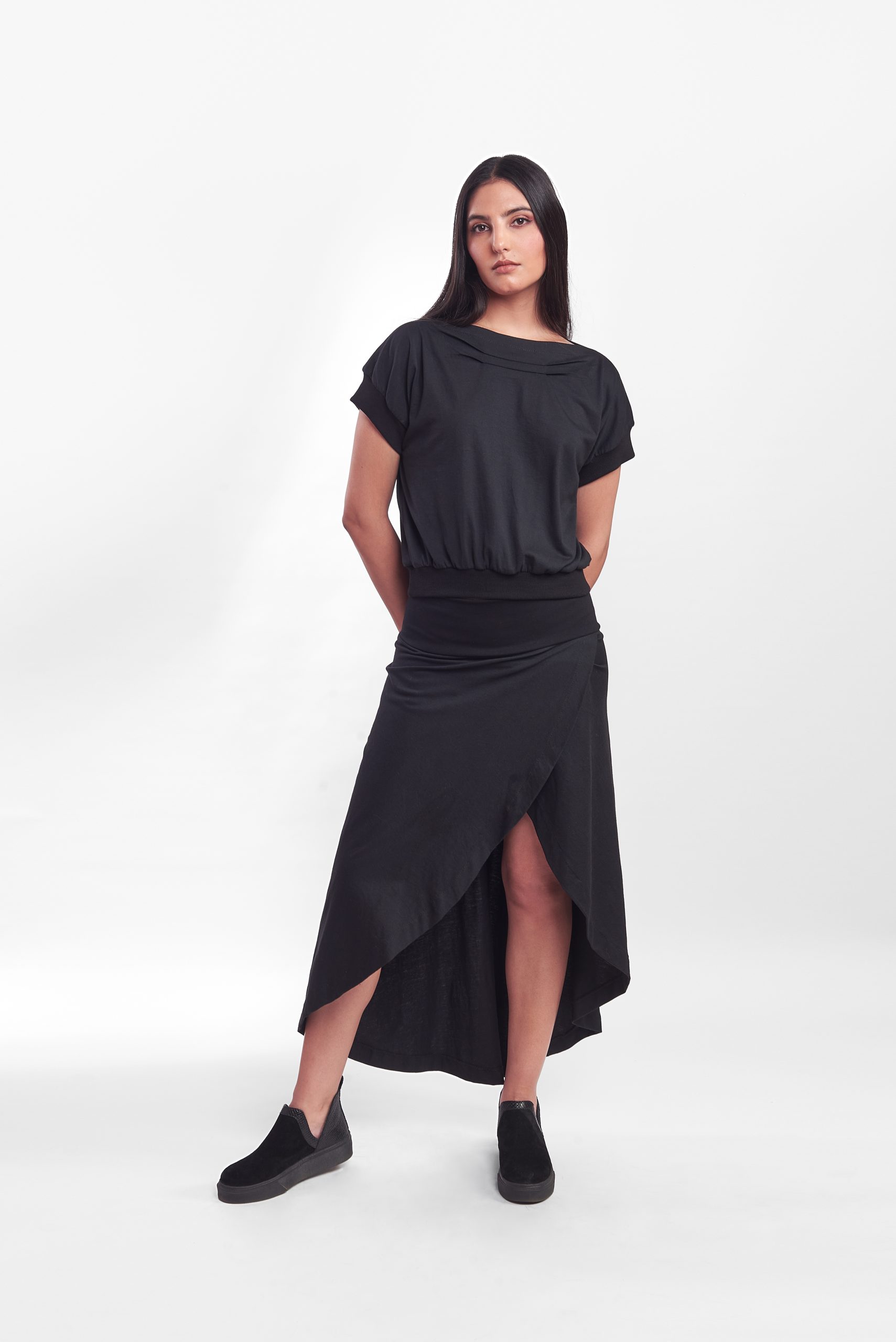 Falda de corte circular cruzada en el delantero, con pretina de lycra algodón que permite un calce cómodo y se adapta a variados cuerpos.